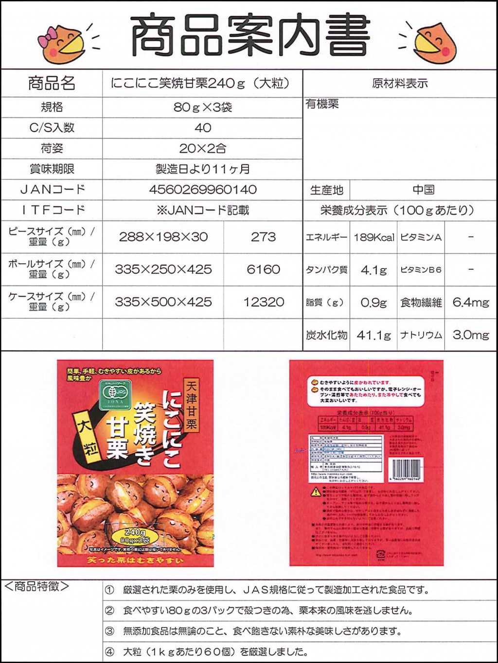その他 | にこにこ笑焼き甘栗240g(大粒)80g×3袋 関連リンク 検索 リスト 本文 《商品特徴》 厳選された栗のみを使用し、JAS規格に従って製造加工された商品です。 食べやすい80gの3パックで殻付きの為、栗本来の風味を逃しません。 無添加食品は無論のこと、食べ飽きない素朴な美味しさがあります。 大粒(1kgあたり60個)を厳選しました。 検索 リスト