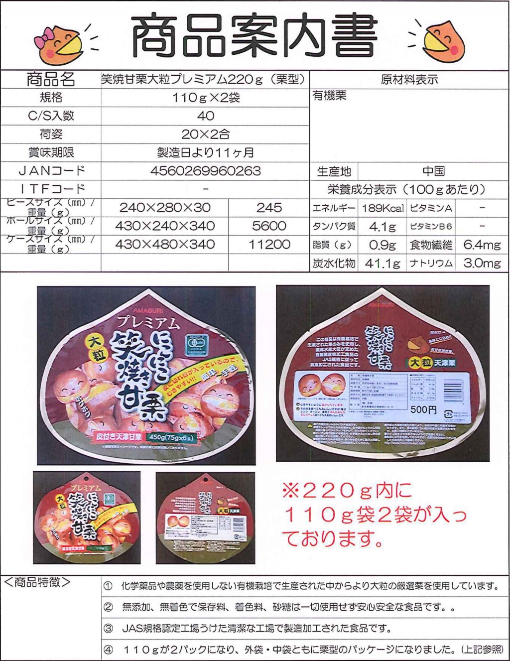 その他 | 笑焼き甘栗大粒プレミアム220g(栗型)110g×2袋 関連リンク リスト 本文 《商品特徴》 化学薬品や農薬を使用しない有機栽培で生産された中からより大粒の厳選栗を使用しています。 無添加、無着色で保存料、着色料、砂糖は一切使用せず、安心安全な食品です。 JAS規格認定工場で製造加工された食品です。 110gが2パックになり、外袋・中袋ともに栗型のパッケージになりました。 リスト