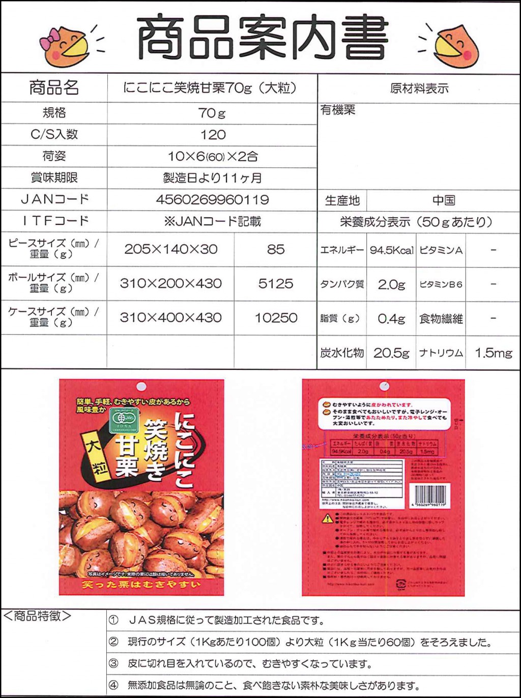 その他 | にこにこ笑焼き甘栗70g(大粒) 関連リンク リスト 本文 《商品特徴》 厳選された栗のみを使用し、JAS規格に従って製造加工された商品です。 現行のサイズ(1kg当たり100個)より大粒(1kg当たり60個)を揃えました。 皮に切れ目を入れているので、むきやすくなっています。 無添加食品は無論のこと、食べ飽きない素朴な美味しさがあります。 リスト