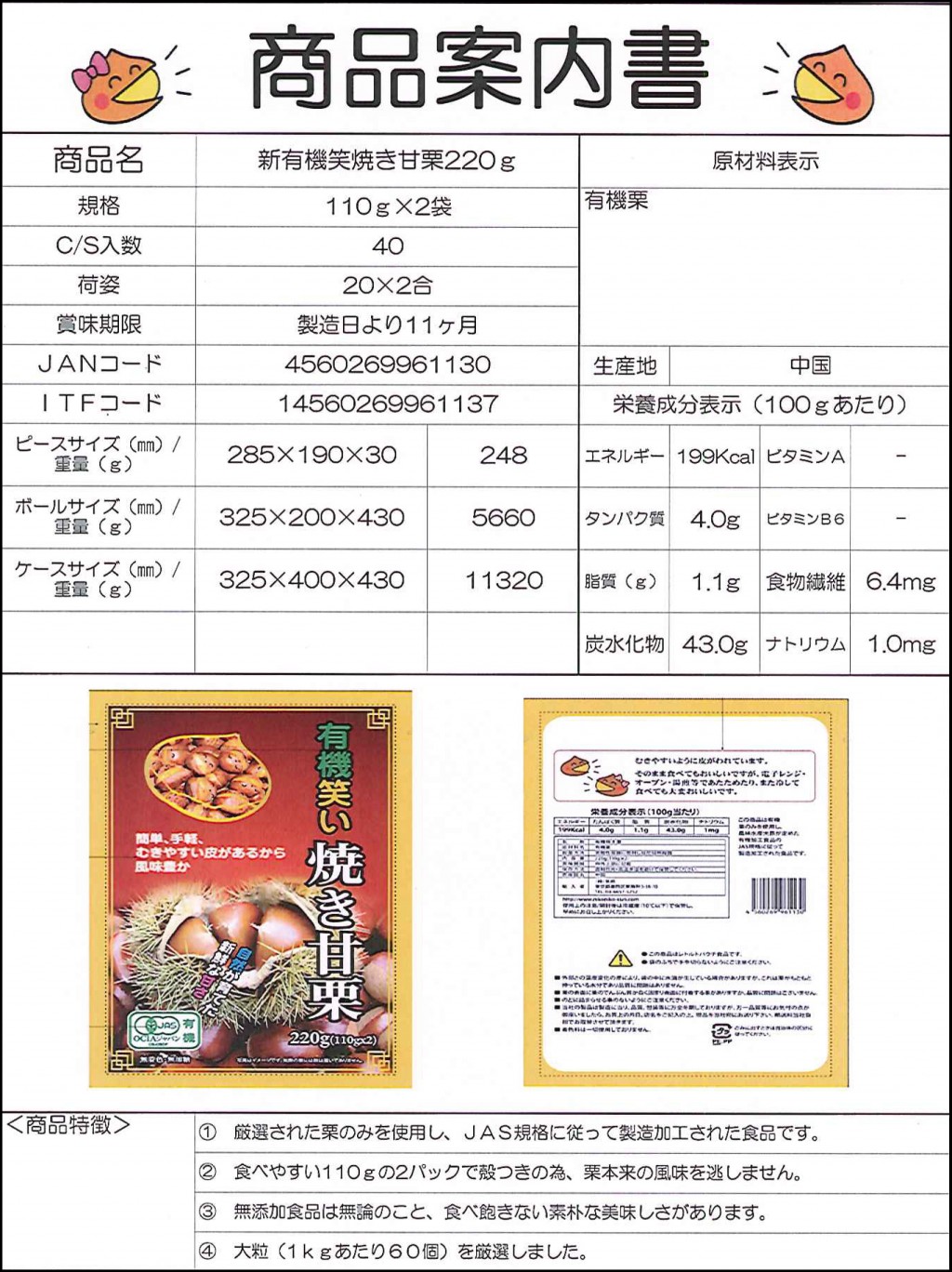 その他 | 新有機笑焼き甘栗220g 110g×2袋 関連リンク リスト 本文 《商品特徴》 厳選された栗のみを使用し、JAS規格に従って製造加工された商品です。 食べやすい110 gの2パックで殻付きの為、栗本来の風味を逃しません。 無添加食品は無論のこと、食べ飽きない素朴な美味しさがあります。 大粒(1kgあたり60個)を厳選しました。 リスト
